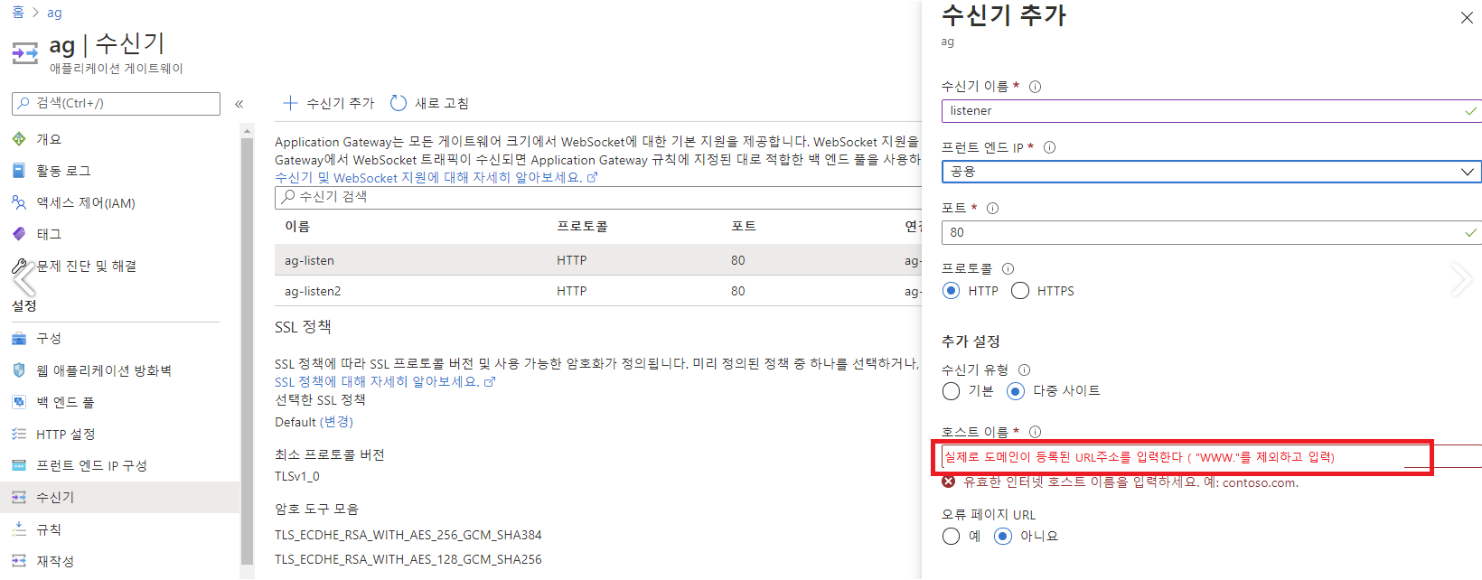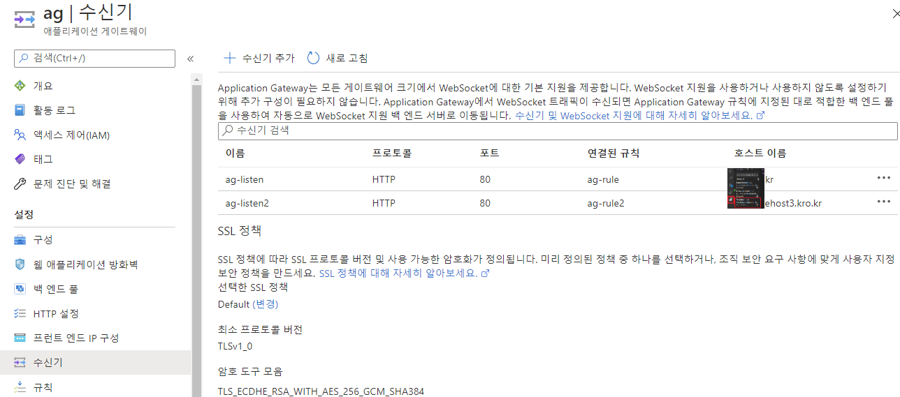 ![]() → 백엔드 풀 설정 (URL경로기반 라우팅을 하기때문에 n개의 백엔드 설정값이 필요하다,) ![]() → 수신기 설정 (이름, 프론트엔드, 포트를 설정해주고 수신기유형은 URL기반으로 라우팅될 수 있도록 '다중사이트'를 선택해준다) ![]()