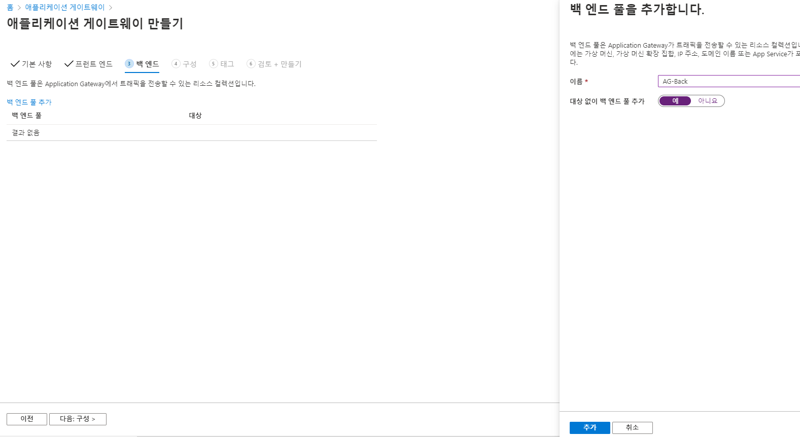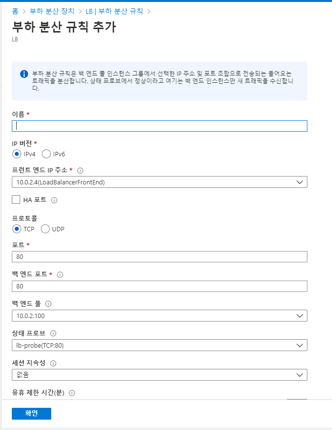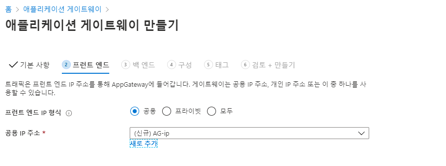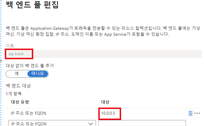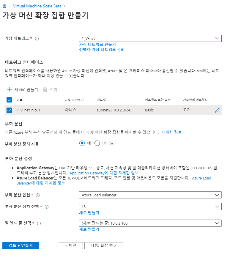 ☞ 네트워크는 서브넷2를 선택하고 프론트엔드(부하분산장치)는 로드밸런서를 선택한다 (서브넷1은 AG가 할당되어 사용할 수 없다)