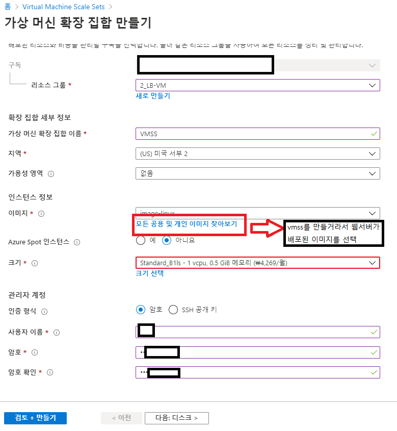 ☞ VMSS를 사용하기 위해 이미지 파일은 이전에 생성해뒀던 이미지로 생성한다