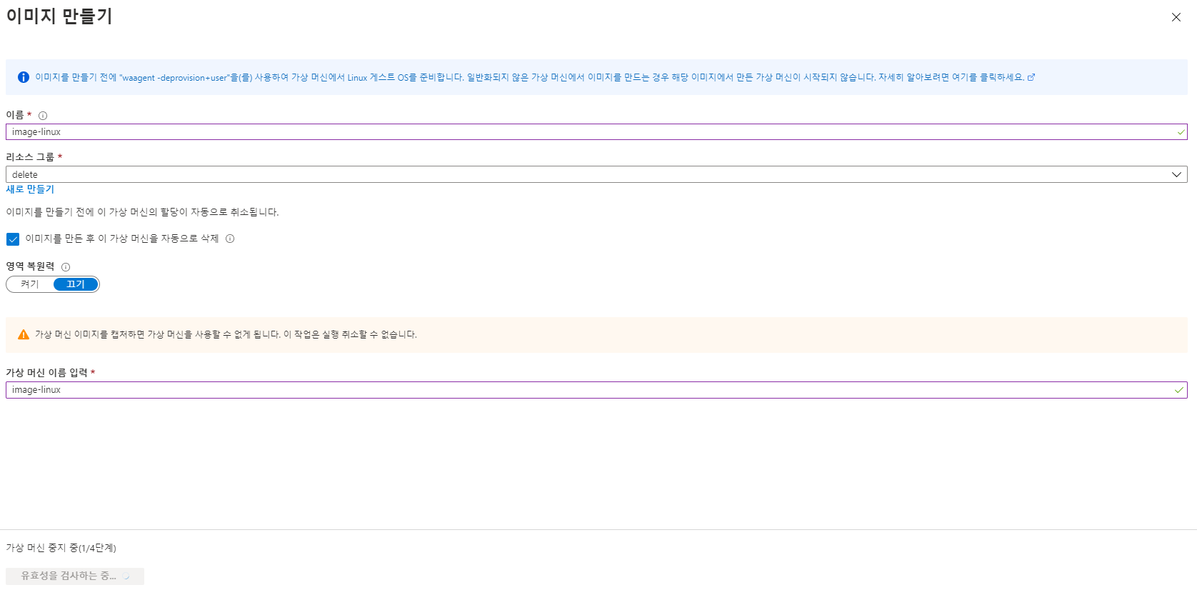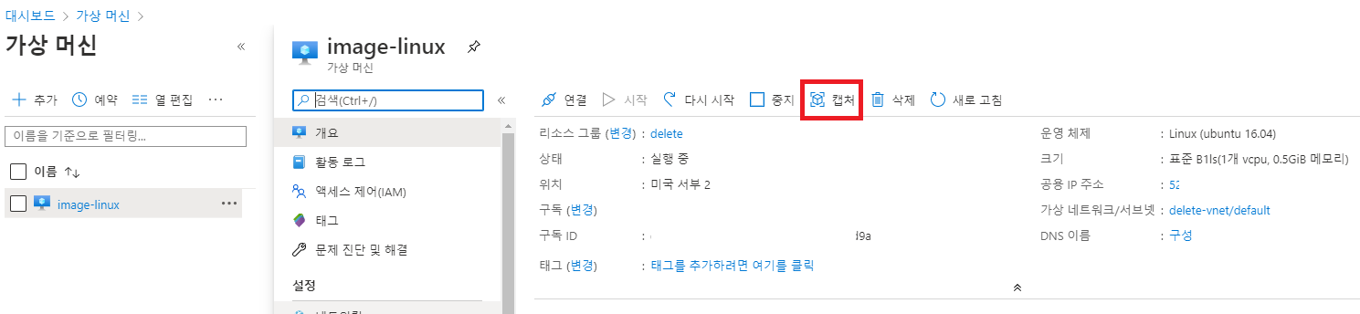 2. 이미지를 캡쳐하면서 "이미지를 만든 후 가상 머신을 삭제"를 Check해준다. (비용절약이 이유)