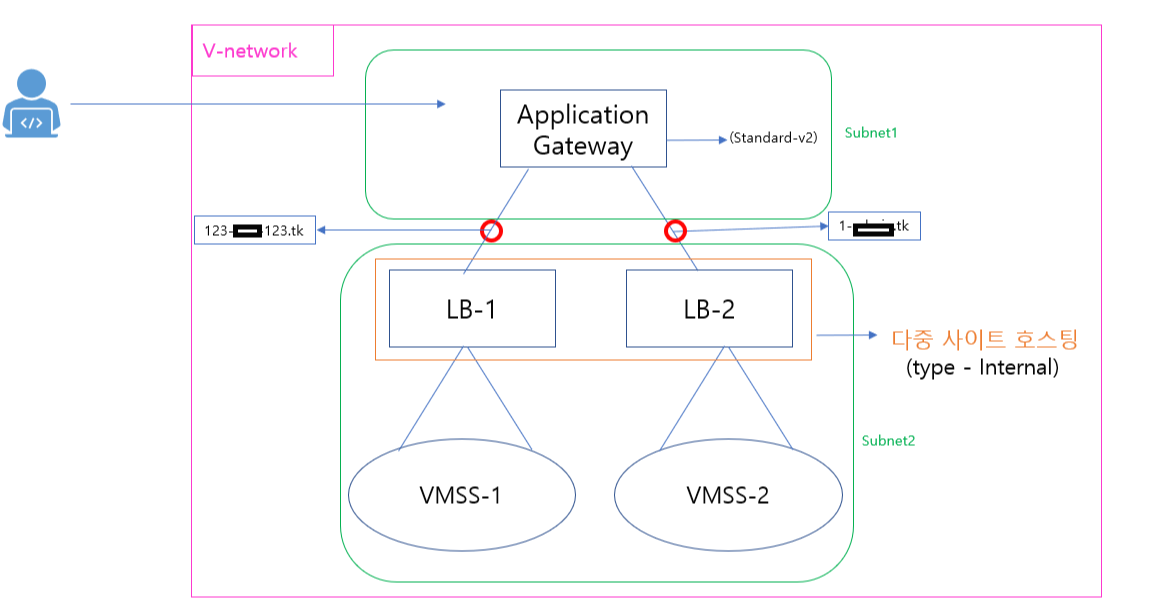 로드밸런서는 2개를 만들어서 하나는 VMSS1를 가리켜 a1.com 을 또다른 하나는 VMSS2를 가리켜 2b.com을 가리킬수있게 한다