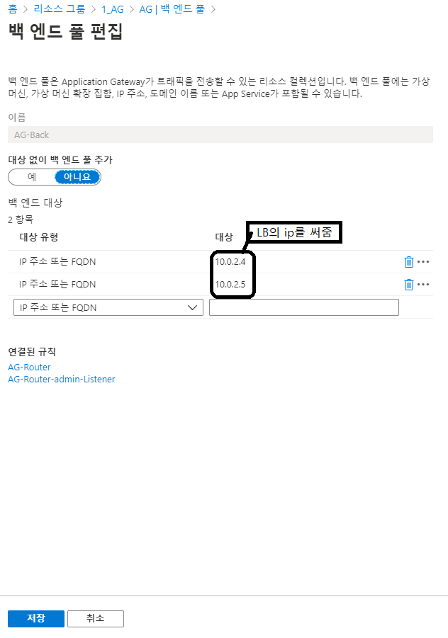 당연하지만, 백 엔드를 지정해 주기전 로드밸런서가 생성되어있어야지 ip를 써줄 수 있다