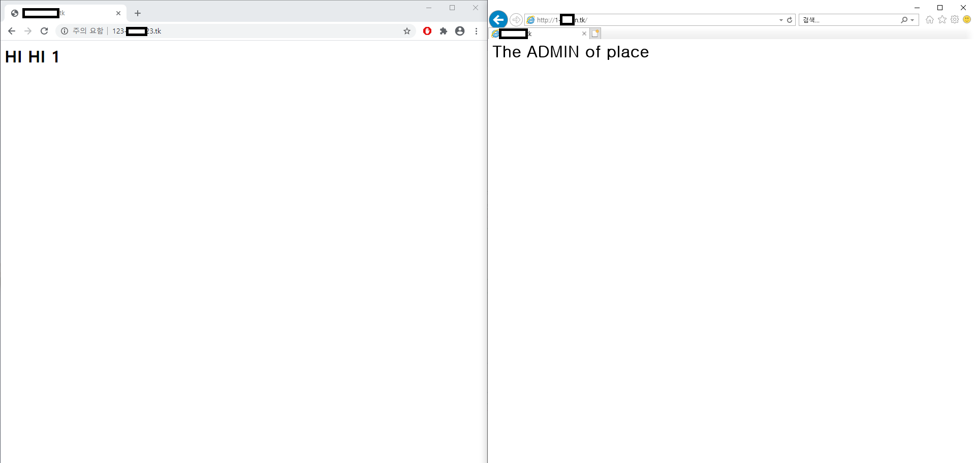 123**.com를 접속하면 'HI HI 1"이라는 문구를 볼수있고, 1-**.com를 접속하면 관리자페이지를 볼수 있다