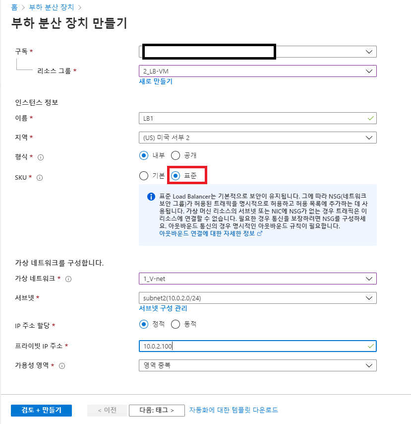 표준을 선택해주고 동일 가상네트워크을 선택하고 서브넷2를 선택해준다