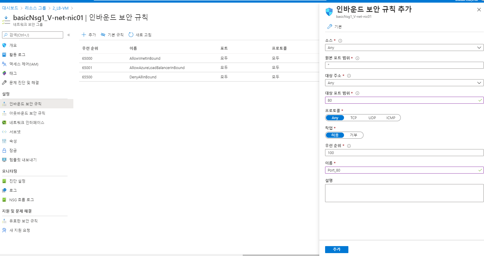 12. 마지막으로 가상네트워크(V-Net1) 인바운드 규칙을 수정한다