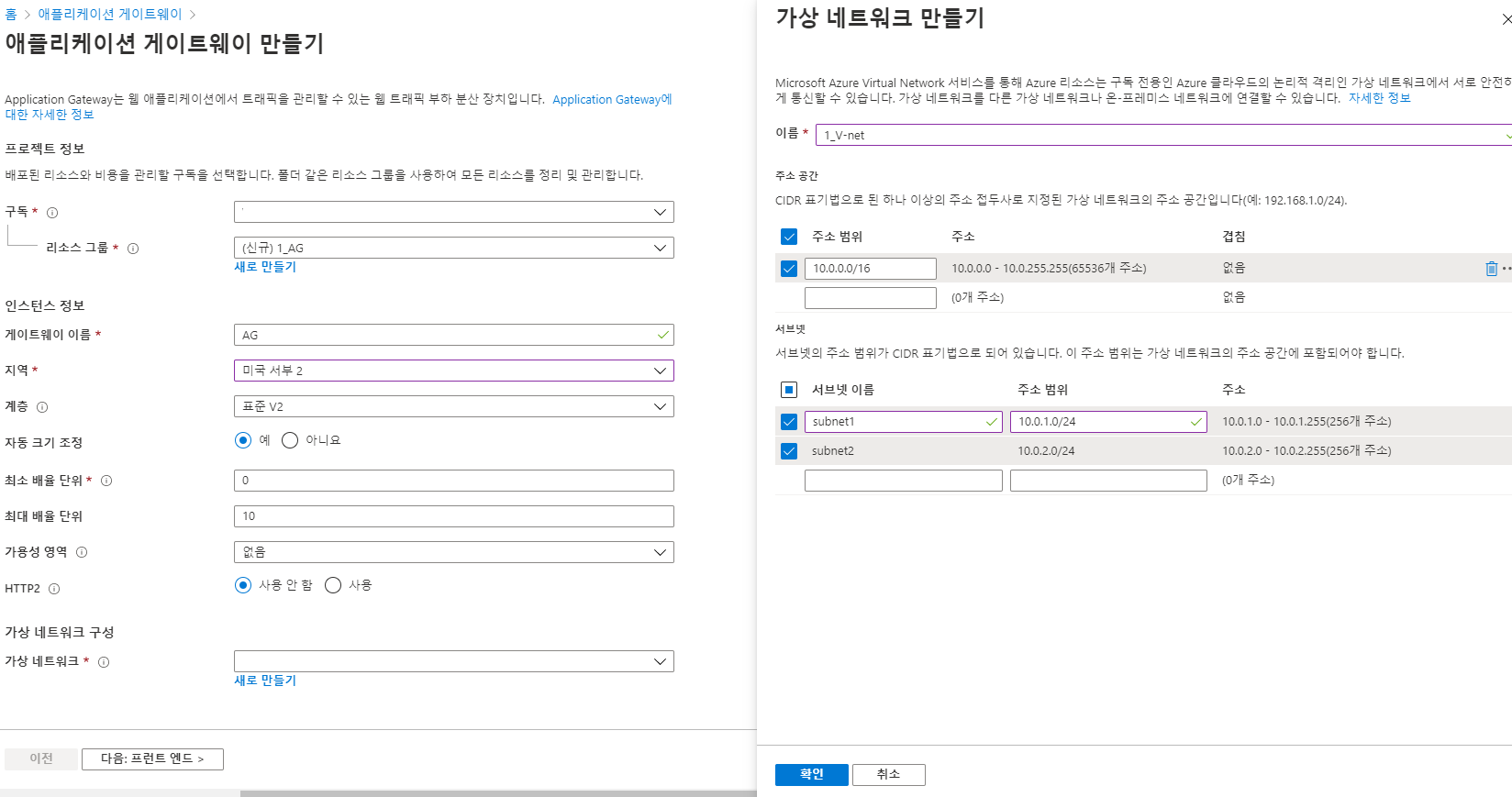 서브넷1,서브넷2를 만들었는데 서브넷1을 사용 못하는 이유는 어플리케이션 게이트웨이가 하나를 모두 할당 받고있기때문에 서브넷2만 이용 가능하다