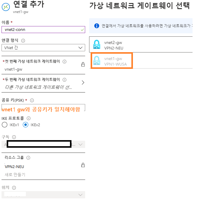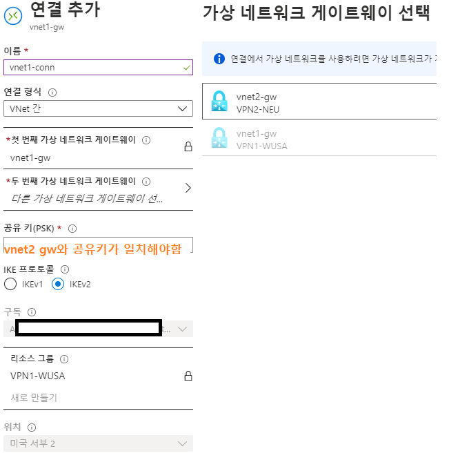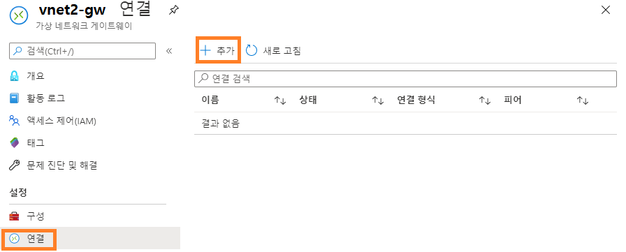 - 연결 → 추가 → Vnet2 게이트웨이선택