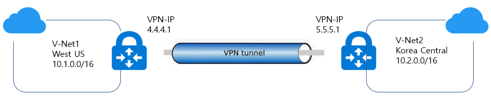 - Network Connection VNet-To-VNet : 이 방법은 복잡한 네트워크 구성으로 작업하는 경우 사용하면 좋고, 온프레미스 위치의 사이트간 IPsec 연결을 만드는 것과 유사하다. 클라우드에서는 VPN 게이트웨이를 사용해 IPsec/IKE와 함께 보안 터널을 제공하고 통신도 동일한 방식으로 작동한다