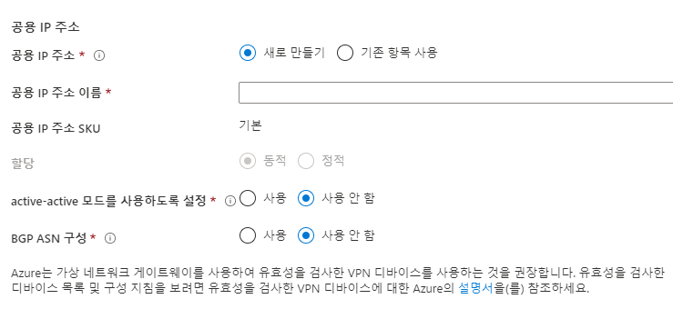 4. 가상네트워크 게이트웨이 생성 2번과 동일한 작업 진행