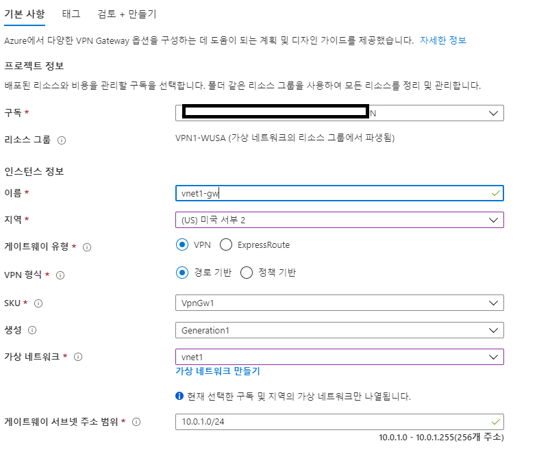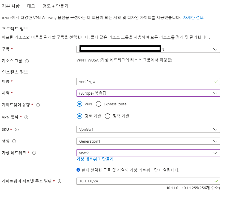 - 1번 가상네트워크 게이트웨이와 다른 리전에 생성 (리전간 통신을 테스트하기위해)