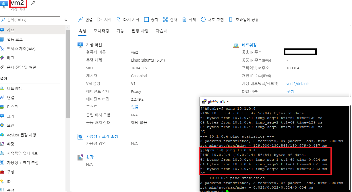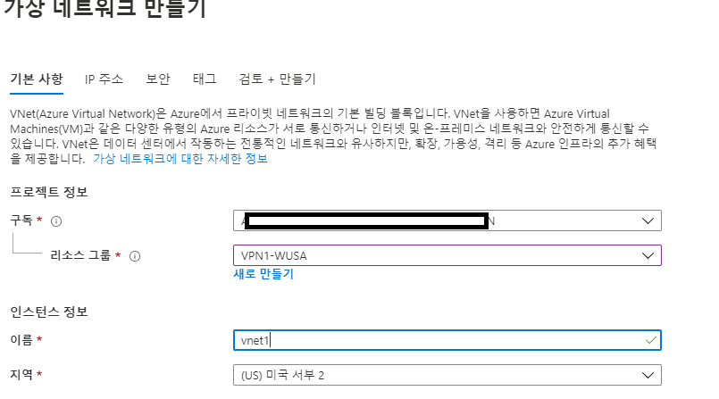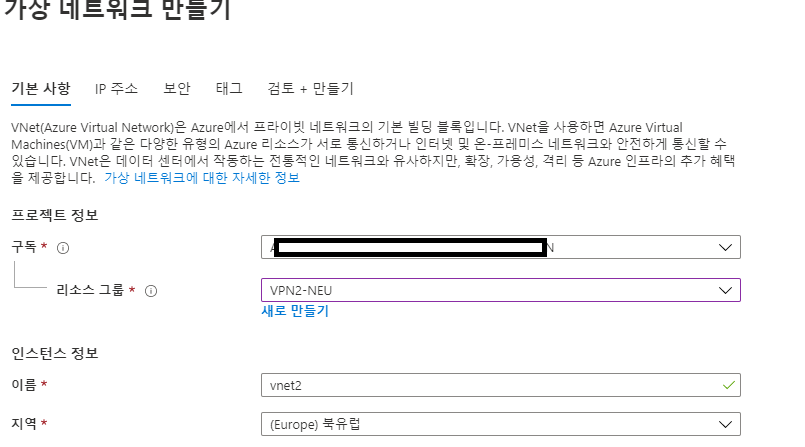 - 1번 가상네트워크와 다른 리전에 생성 (리전간 통신을 테스트하기위해)