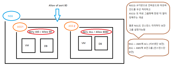 - ASG : NSG를 어플리케이션 구조로 구성해 뒷단에서 가상 머신을 그룹화해 그룹별로 네트워크 보안 정책을 정의 할수있습니다.