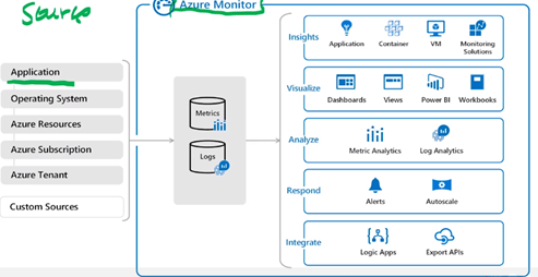 - Azure Monitor : 클라우드와 온프레미스 환경에서 모두 모니터링을 할 수 있고, 아래 그림에 모니터링을 할 수 있는 리소스를 알수 있음