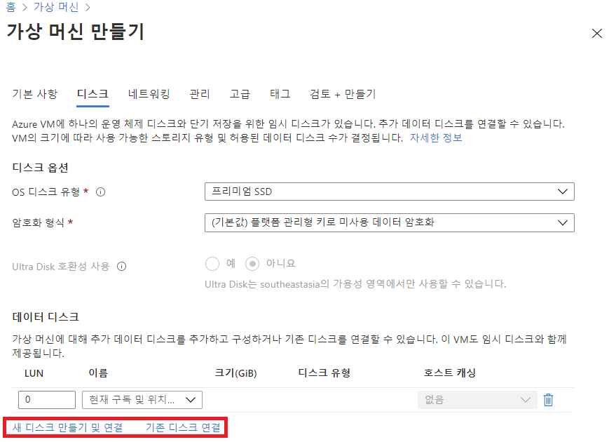 ✔ 가상머신 생성합니다 기본 사항을 적당히 입력해주고 [디스크 탭]에서 데이터 디스크 부분에 새 디스크 만들기 또는 기존 디스크 연결을 해줍니다