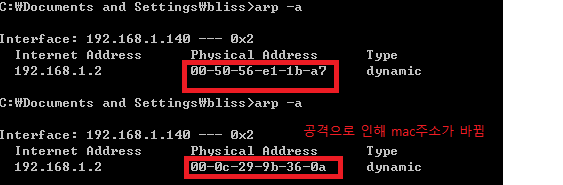 * 본체의 맥주소 확인방법 < 스푸핑 공격을하면 맥주소가 공격자의 맥주소로 바뀜 >