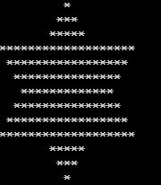 for(i=13; i>0; i--) { if(i>10) { for(j=0; j<i-4; j++) { printf(" "); } for(j=0; j<k; j++) { printf("*"); } k=k+2; printf("\n"); } if(i<11 && i>6) { for(j=1; j<p; j++) { printf(" "); } for(j=0; j<g; j++) { printf("*"); } g=g-2; printf("\n"); p++; } if(i<7 && i>3) { for(j=0; j<=t; j++) { printf(" "); } for(j=0; j<r; j++) { printf("*"); } t=t-1; r=r+2; printf("\n"); } if(i<4 && i>0) { for(j=0; j<e; j++) { printf(" "); } for(j=0; j<ee; j++) { printf("*"); } ee=ee-2; printf("\n"); e++; } } PAS; } |