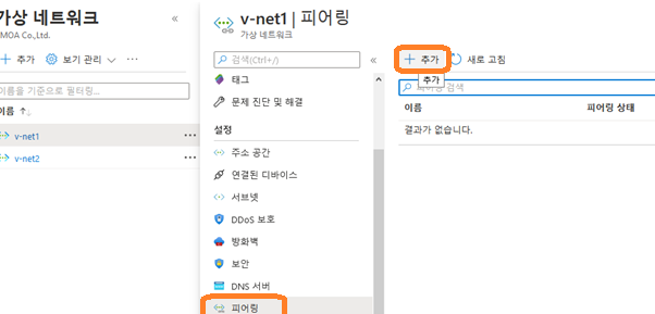 3. 임의 가상 네트워크에서 피어링 탭을 클릭하고 추가해준다